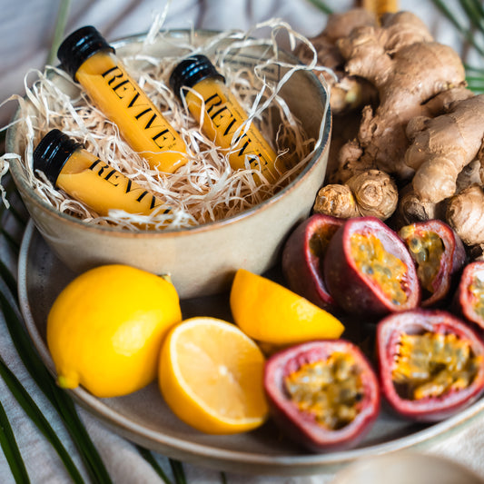 De lekkerste, meest natuurlijke Gembershotjes met een touch passievrucht en citroen